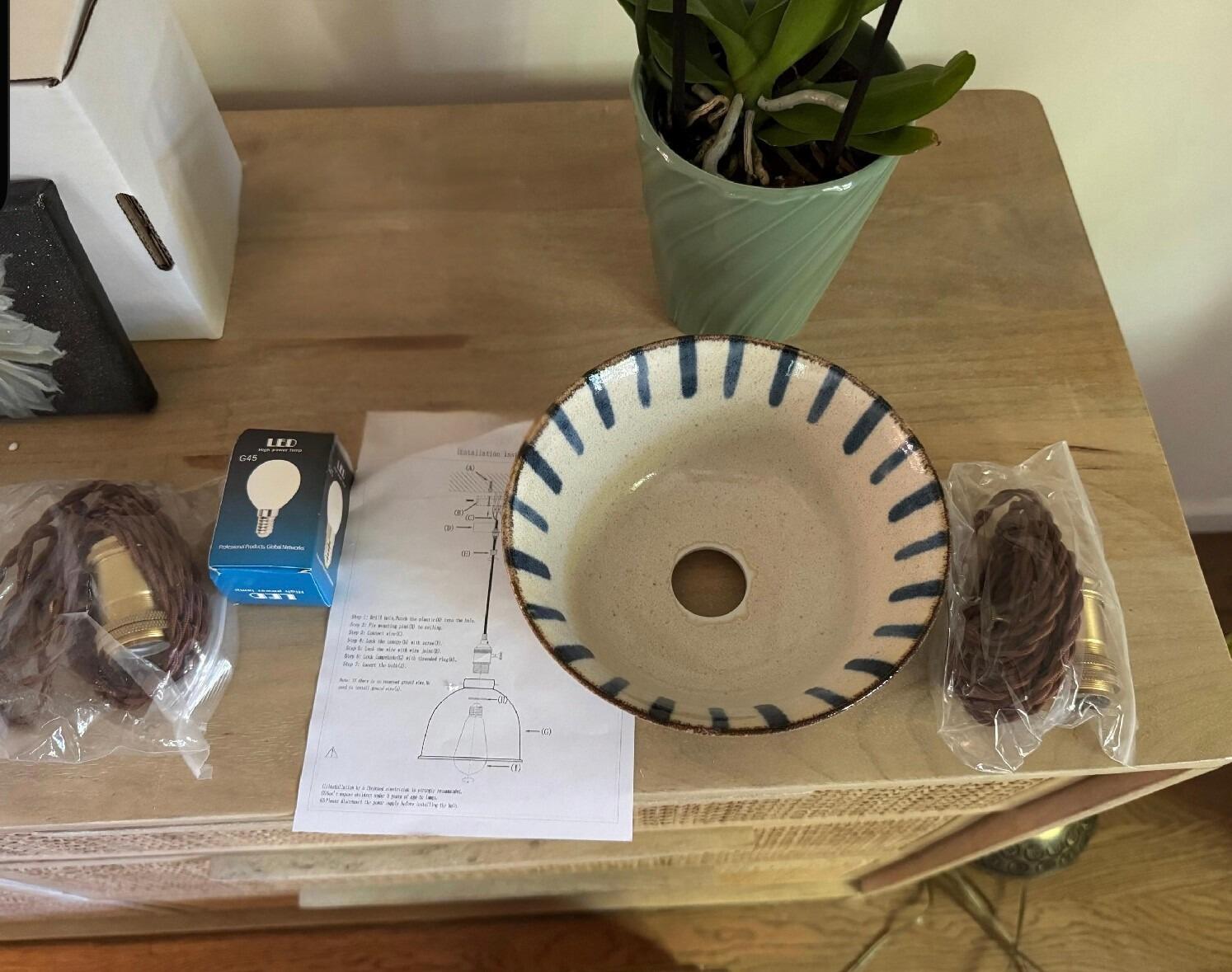 Lampshade, adjustable cord, ceiling canopy/fixture, instruction guide, and E27 LED bulb.