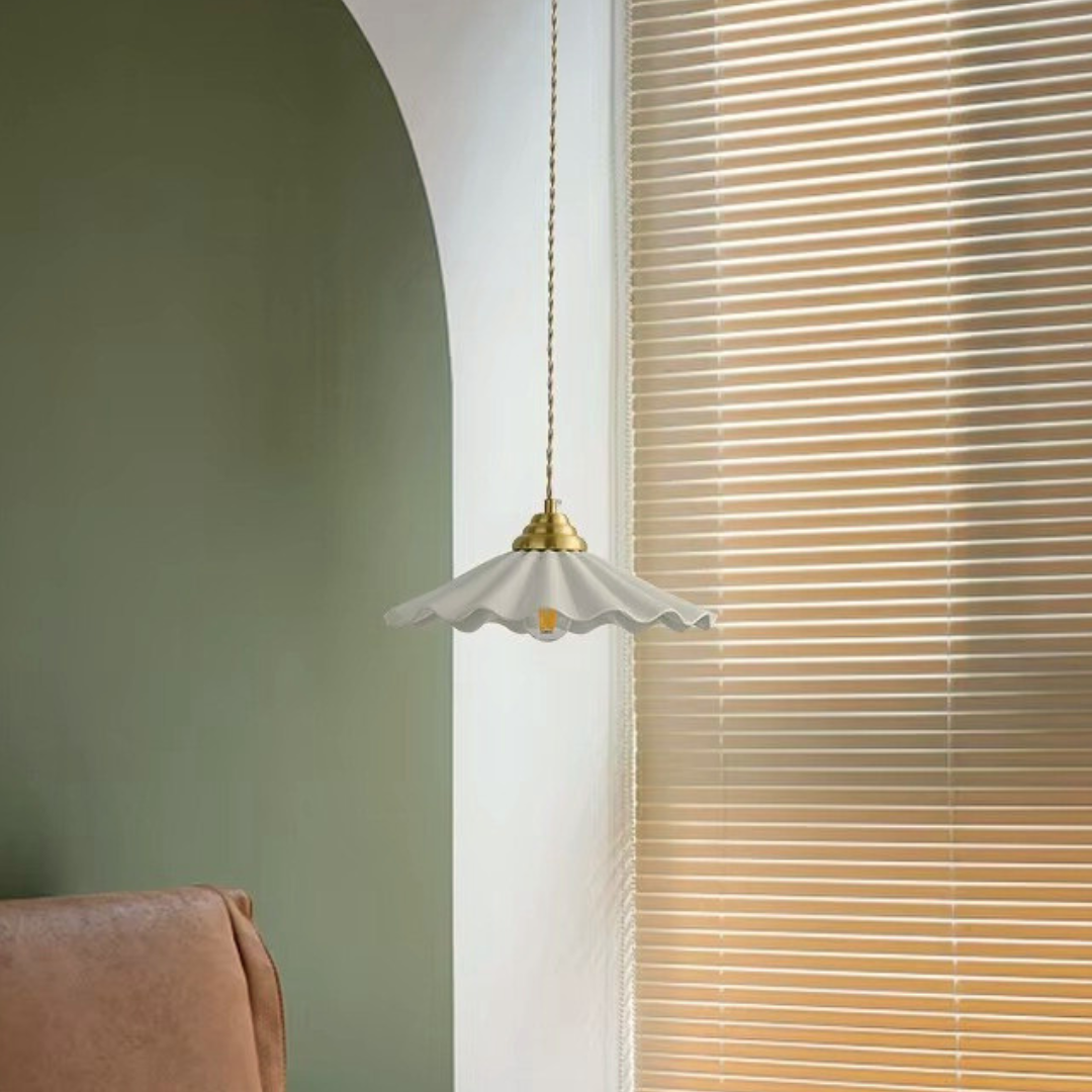 Calm, sculptural, and quietly striking. This pendant features a gently scalloped ceramic shade in soft white that diffuses light into a soothing, ambient glow. Its minimalist silhouette feels modern yet warm, lending subtle character to kitchens, dining corners, reading nooks, cafés, or boutique spaces.