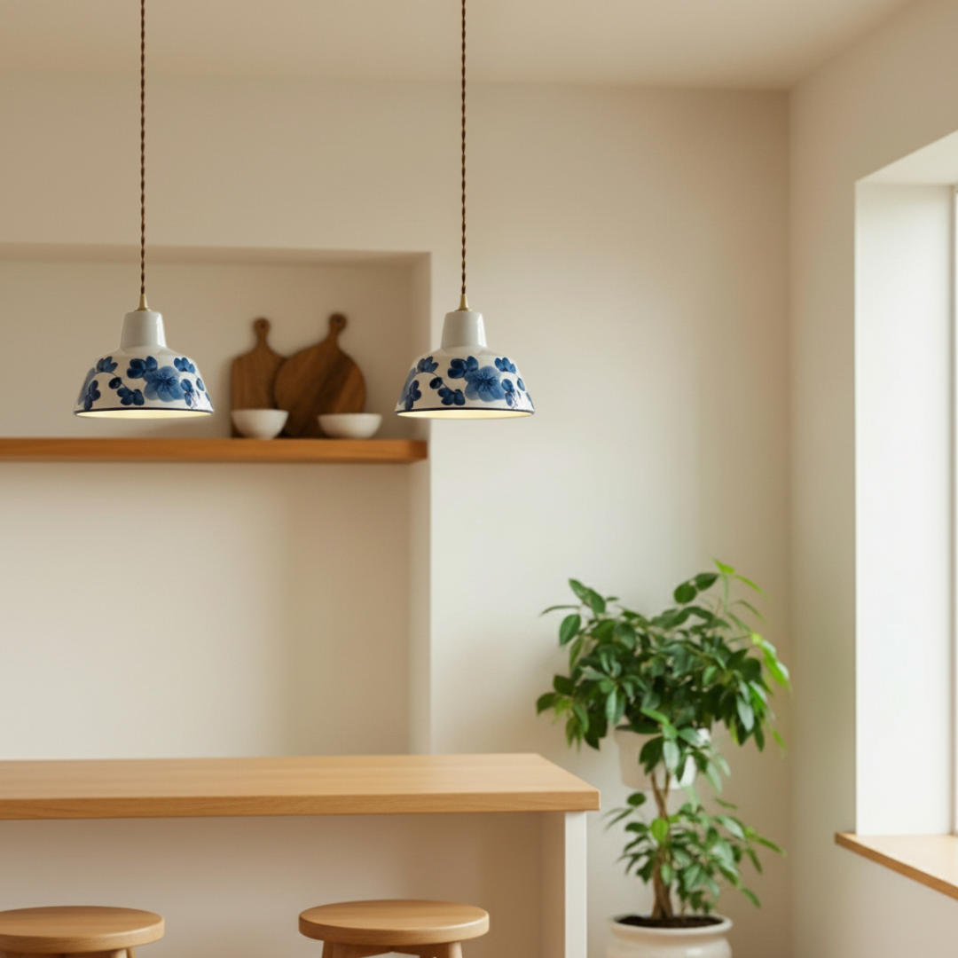 Bring quiet character and a timeless glow to your space. Our Kyoto Blue hand-painted ceramic pendant layers serene indigo florals over a minimalist silhouette, perfect for calm, sophisticated interiors. It casts a softly diffused light above kitchen islands, dining tables, bedside corners, or reading nooks and blends effortlessly with both modern and traditional decor.