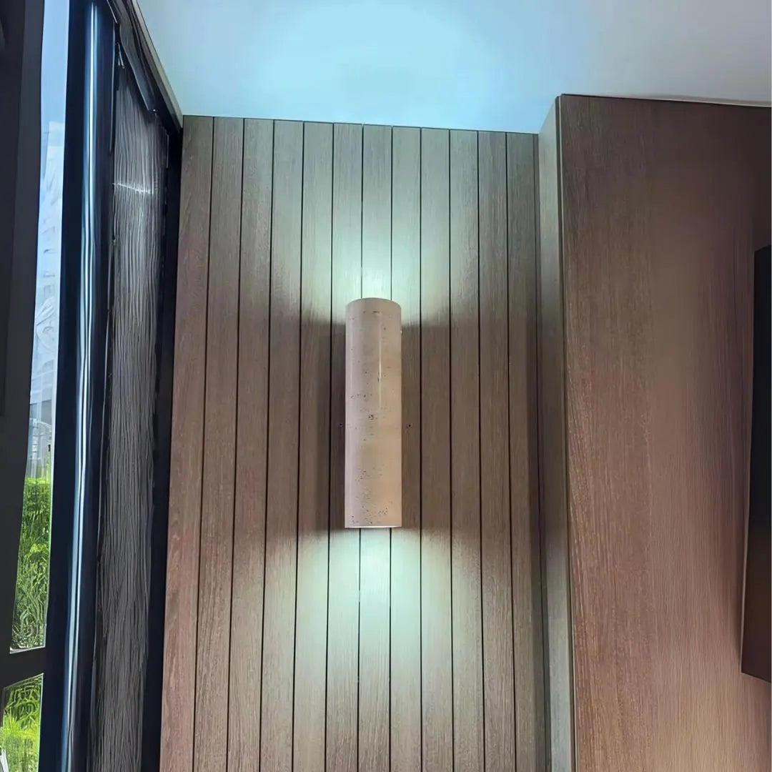 Carved from genuine travertine stone, this minimalist wall lamp pairs organic texture with soft, modern lines. Its cylindrical form and natural pores create a serene, sculptural presence. Perfect for bedrooms, hallways, or reading corners that call for understated sophistication.
